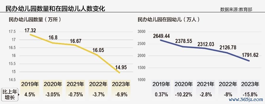 学前教育是民办学校占比最高的教育阶段,截至2023年民办幼儿园占全国幼儿园总数的54.47%,但也是下降最快的教育阶段,2023年全国民办幼儿园比上年减少11013所。适龄儿童人数持续减少,民办幼儿园还将继续关停。同时,有的地方仍在大力新建公办幼儿园,公办园幼儿占比已经接近85%。