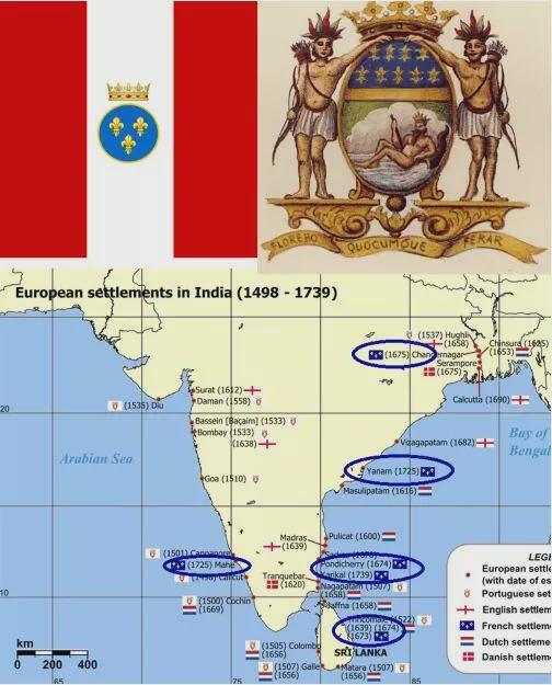上图_ 18世纪 法国东印度公司的旗帜 徽章和主要据点